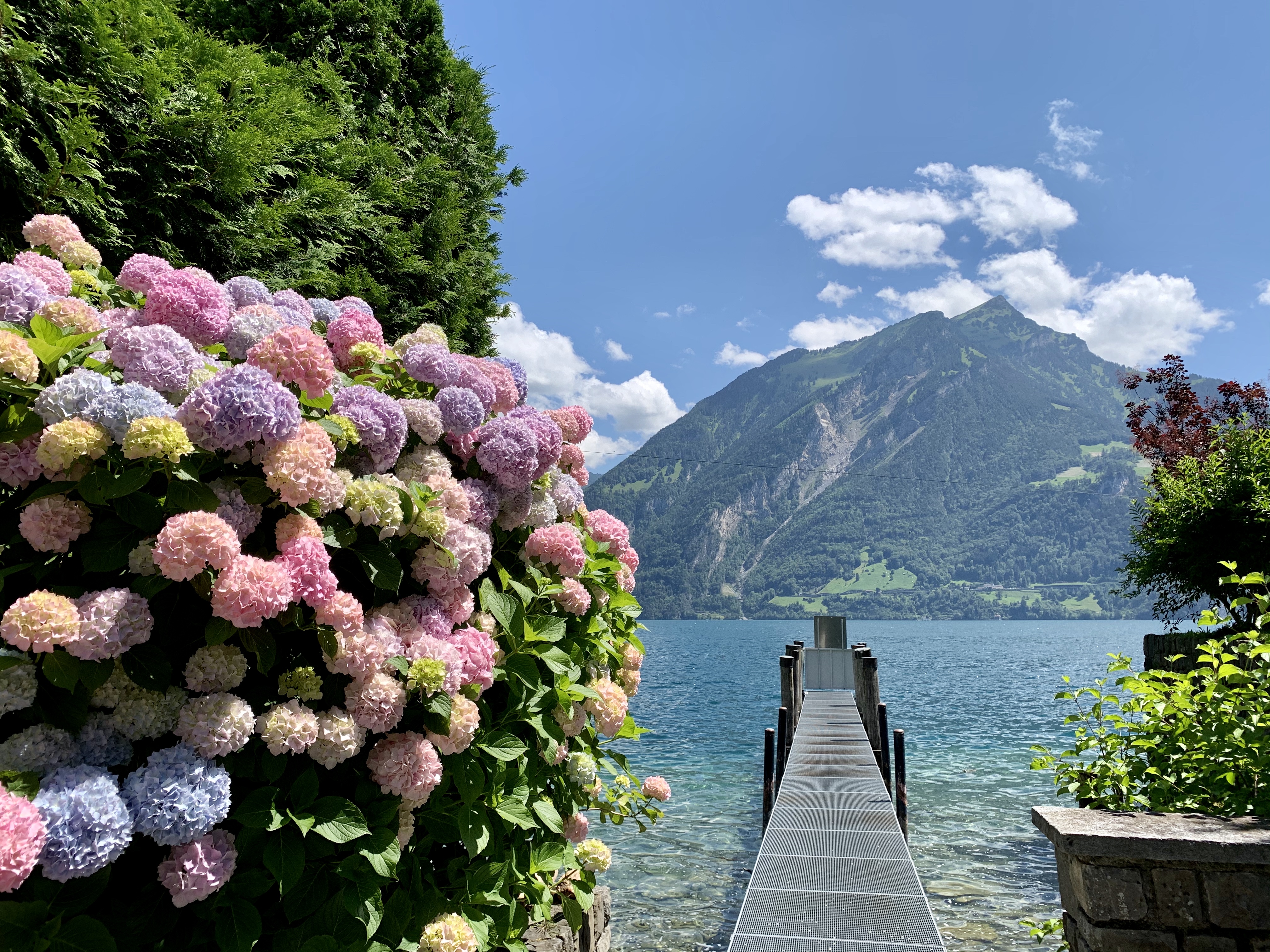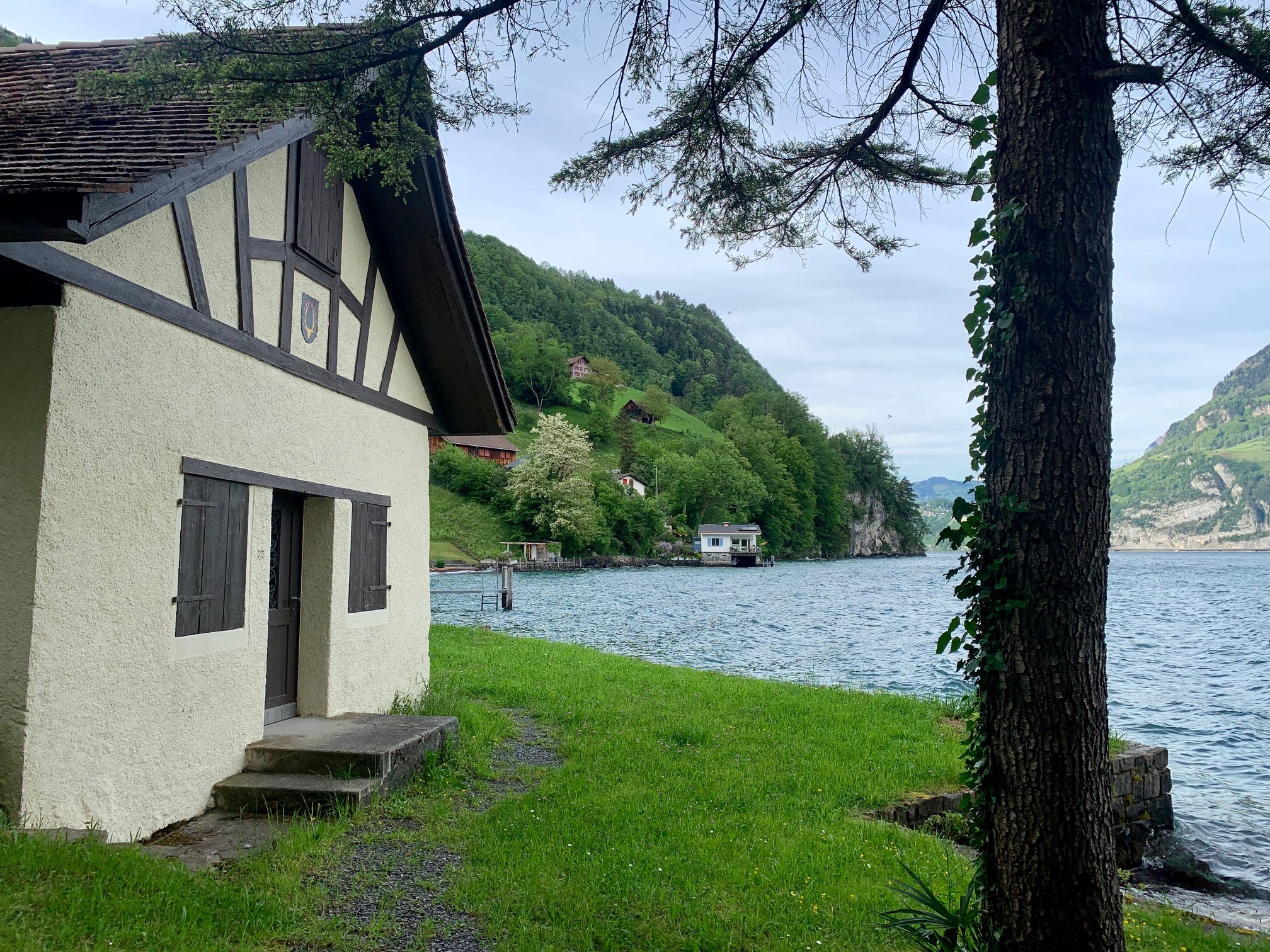 Es erwartet dich eine Sauna aus schweizer Arvenholz und dank eines Panoramafensters einen einzigartigen Blick auf die Berge und den Urnersee.